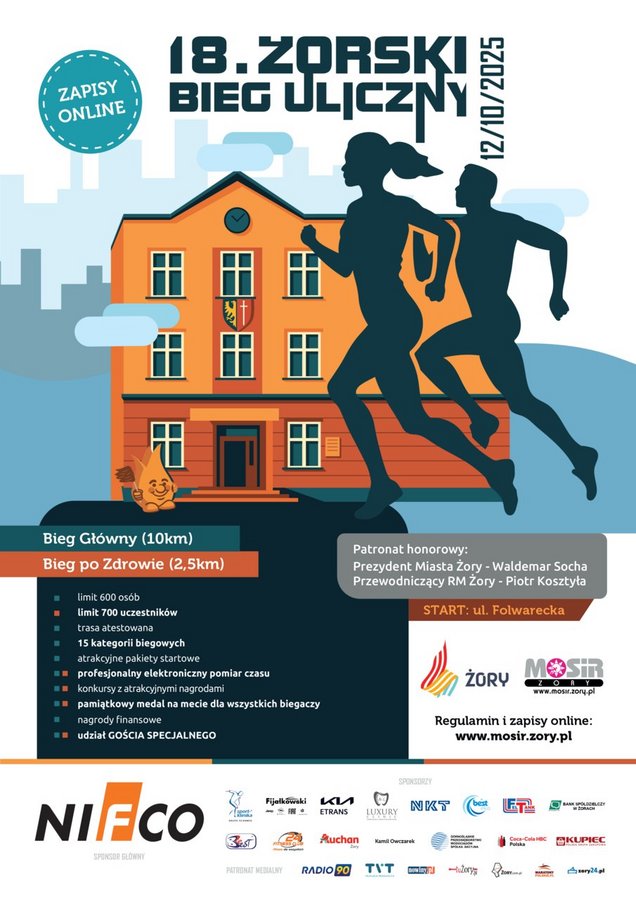 Do 8 października, do godz. 23:59 trwają zapisy internetowe do największej imprezy biegowej w Żorach, która odbędzie się 12 października. W programie imprezy tradycyjnie wytrawni biegacze pokonają trasę 10 km, zaś z dystansem 2.5 km zmierzą się uczestnicy Biegu po zdrowie, czyli głównie mieszkańcy Żor, którzy często ze swoimi dziećmi biorą udział w biegu (dokładne trasy obu dystansów znajdziecie na stronie https://mosir.zory.pl/18-zorski-bieg-uliczny-zapisy-ruszyly/