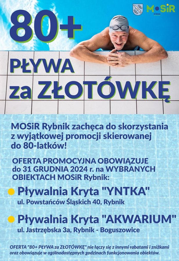 W ramach oferty promocyjnej "80+ PŁYWA za ZŁOTÓWKĘ" do 31 grudnia 2024 roku zapłacicie za wstęp na basen tylko 1 zł. Oferta nie łączy się z innymi rabatami i zniżkami oraz obowiązuje w ogólnodostępnych godzinach funkcjonowania obiektów: