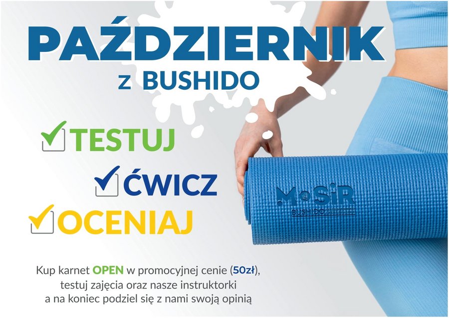 Centrum Rekreacji i Rehabilitacji "Bushido" zachęca do zakupu promocyjnego karnetu w cenie 50 zł. – Takiego karnetu jeszcze nie było. Można sprawdzić, które zajęcia najbardziej ci odpowiadają. Mówiąc wprost: testuj, ćwicz, oceniaj. Twoja opinia jest dla nas bardzo ważna – twierdzą organizatorzy zajęć w Bushido.