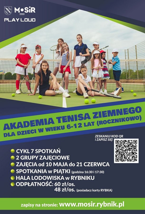 MOSiR Rybnik przy współpracy z firmą Play Loud uruchamia Akademię Tenisa Ziemnego. Do nauki gry w tenisa ziemnego zapraszamy dzieci w wieku 6 - 12 lat (rocznikowo).
